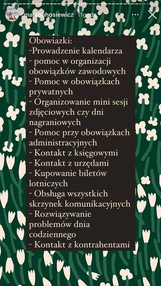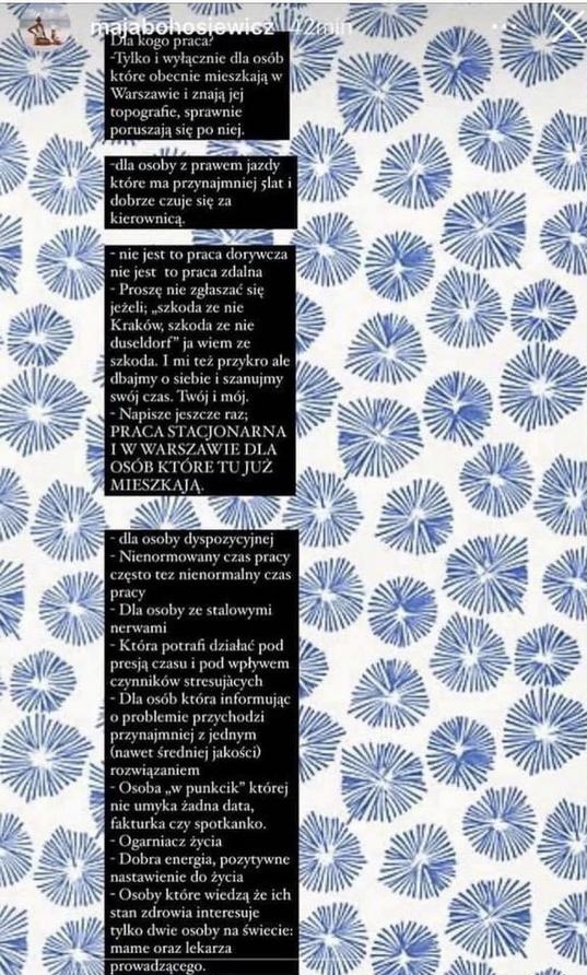 Maja Bohosiewicz jest znaną aktorką i influencerką, a oprócz tego z powodzeniem prowadzi swoją markę odzieżową. Najwyraźniej gwiazda potrzebuje nowych rąk do pracy, gdyż zamieściła na swoim instastories ogłoszenie, które delikatnie mówiąc, nie przypadło do gustu internautom. Screeny z jego treścią pojawiły się na popularnej na Facebooku grupie „Give Her a Job” i spotkały się z setkami nieprzychylnych komentarzy. Mai Bohosiewicz zarzucano działanie wbrew kodeksowi pracy, oraz brak empatii, pojawiły się też takie określenia, jak „Grażyna biznesu”, a także porównywanie wakatu do...niewolnictwa. Oto treść ogłoszenia: