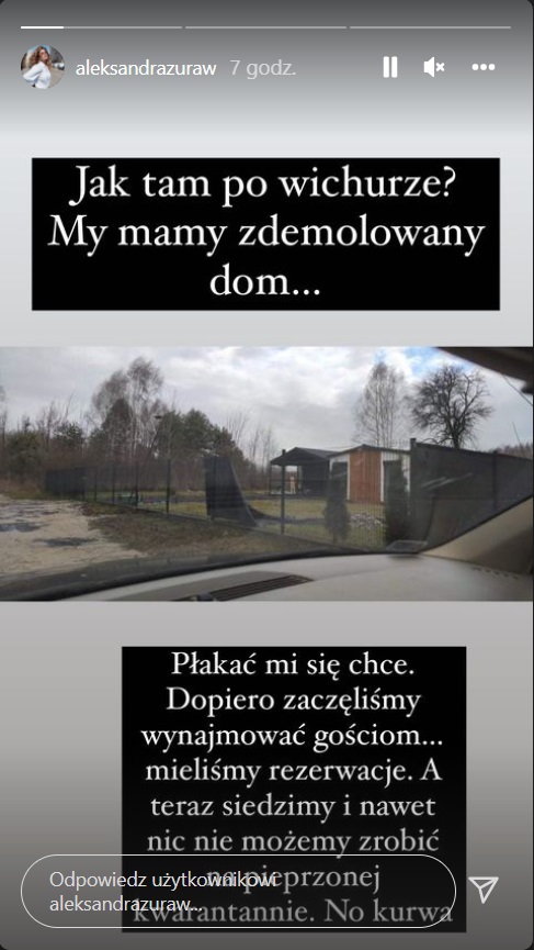 Jak tam po wichurze? My mamy zdemolowany dom. Płakać mi się chce. Dopiero zaczęliśmy wynajmować gościom... Mieliśmy rezerwacje. A teraz siedzimy i nawet nic nie możemy zrobić na pieprzonej kwarantannie. No k***a - napisała na InstaStory Ola Żuraw
