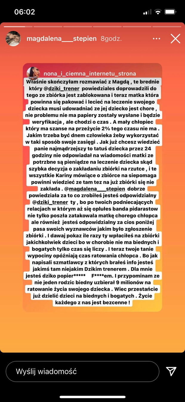 Właśnie skończyłam rozmawiać z Magdą. Te brednie, które powiedział Dziki Trener, doprowadziły do tego, że zbiórka jest zablokowana i teraz matka, która powinna się pakować i lecieć na leczenie swojego dziecka, musi udowadniać, że jej dziecko jest chore - ubolewa osoba cytowana przez Magdę na Instagramie.
