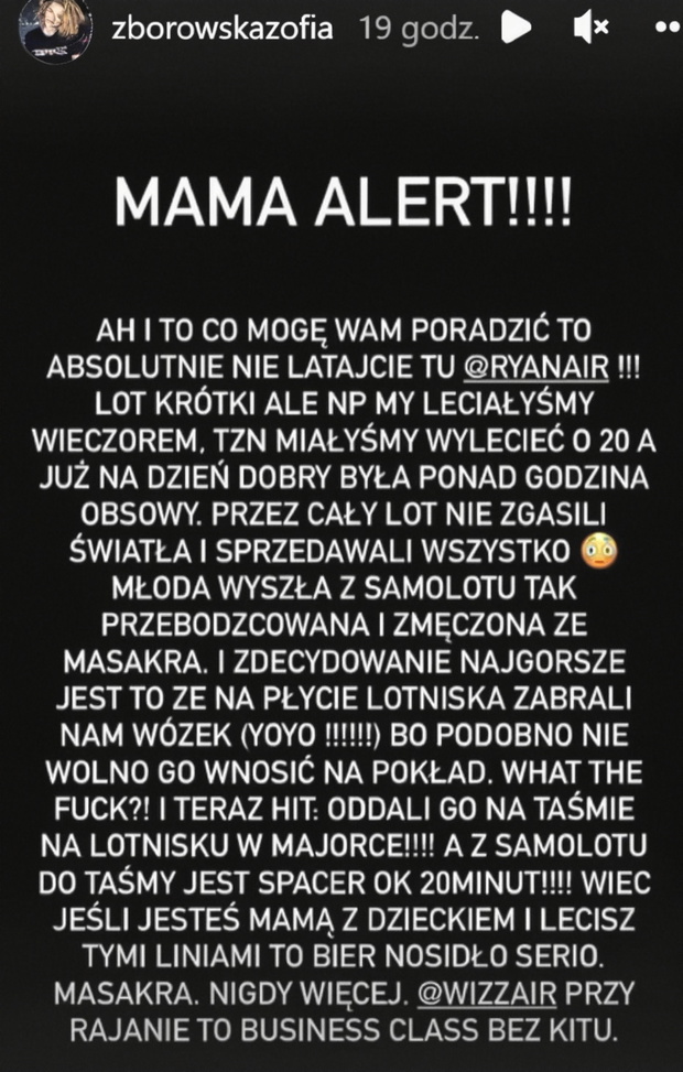 "To, co mogę wam poradzić, to absolutnie nie przylatujcie tutaj linią - Ryanair" - tak zaczęła swoją relację na Instastory Zosia Zborowska. Aktorka dalej zdradziła szczegóły lotu.