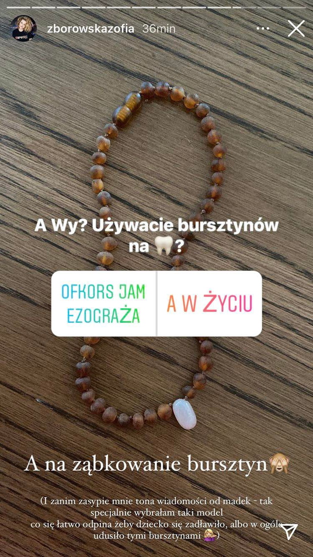 - "I zanim zasypie mnie tona wiadomości od madek - tak specjalnie wybrałam taki model co się łatwo odpina, żeby dziecko się zadławiło, albo w ogóle udusiło tymi bursztynami" - napisała Zosia Zborowska na Instaramie.