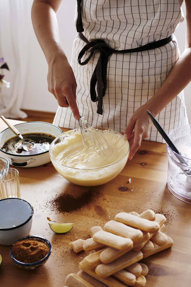 Woman stirring Mascarpone cream for preparing Tiramisu, partial view