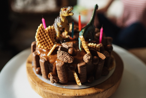 Cool young kids birthdaycake with dinosaurus theme. A beautiful handmade cake covered in chocolate and cookies.
