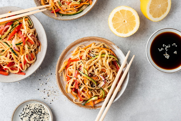 Stir fry rice noodles with vegetables in bowl, top view. Asian cuisine