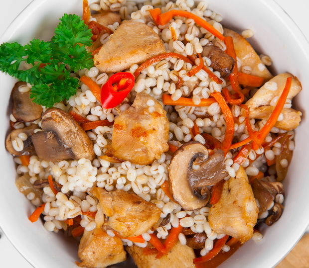 Barley porridge with, meat, mushrooms and carrots