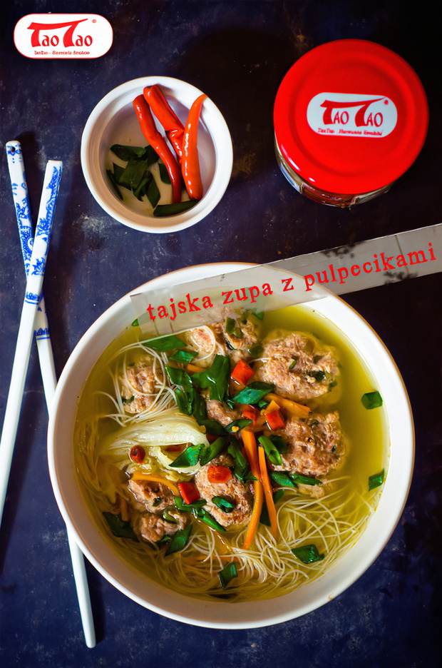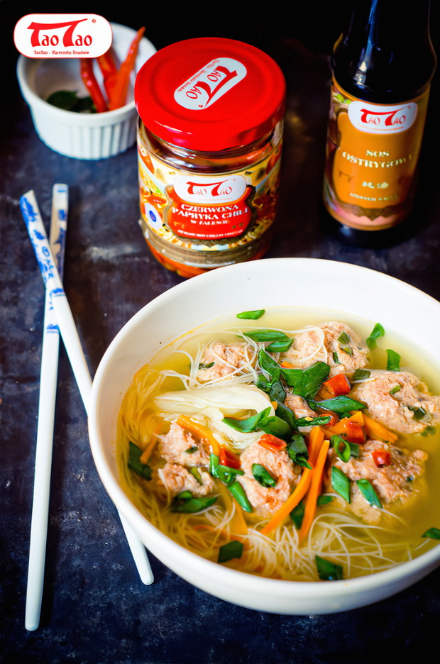 Do mięsa dodać sos ostrygowy, szczypior, drobno pokrojoną papryczkę chili, imbir i skrobię ziemniaczaną. Wymieszać dokładnie i uformować małe kuleczki. Makaron ryżowy zalać gorącą wodą, odcedzić po 5 minutach. Zagotować bulion. Wsypać do niego marchewkę, pokrojony na plasterki czosnek, pokrojone na kawałki liście kapusty pekińskiej, trawę cytrynową, cukier trzcinowy oraz wlać sok z limonki. Doprawić sosem ostrygowym. Następnie wrzucić mięsne pulpeciki i gotować około 10 minut. Podawać z makaronem z brązowego ryżu, krążkami papryczki chili i posiekanym szczypiorkiem.