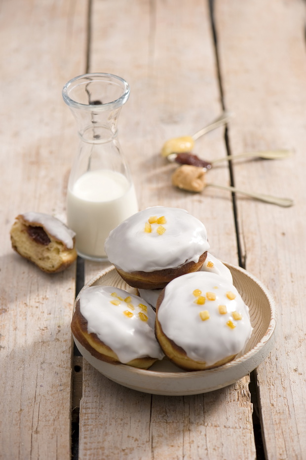 Drożdże rozpuścić w letnim mleku, dodać łyżeczkę cukru, odstawić. Żółtka utrzeć z cukrem białym, dodać do zaczynu, dodać mąkę, wódkę i sól i wyrabiać ciasto, dodając po kawałku masło. Przykryć i odstawić do wyrośnięcia na ok godzinę. Wyrośnięte ciasto przełożyć na oprószoną mąką stolnicę, lekko rozwałkować (na grubość ok 2 cm), krążkiem o średnicy ok 6 cm wykrawać kółka, smażyć w rozgrzanym oleju (olej nie powinien być bardzo gorący, żeby pączki nie spaliły się zewnątrz pozostając w środku surowe. Smażyć na rumiano z obu stron. Osączyć na papierze. Za pomocą szprycy nadziać pączki dżemem i polać polewą – cukier do polew DIAMANT utrzeć z wodą. Pączki przed zastygnięciem polewy można posypać skórką pomarańczową.