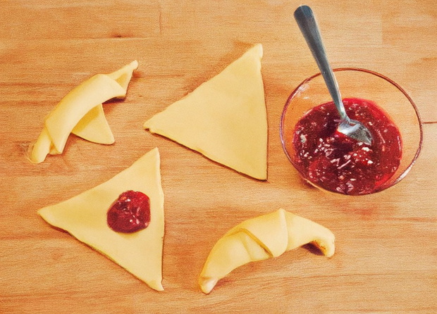 Ciasto rozwałkować na grubość 5 mm, nadając mu formę prostokąta. Pociąć na kilkucentymetrowe pasy, a te podzielić na trójkąty. W środku podstawy każdego trójkąta umieścić łyżeczkę nadzienia i zawijać ciasto w rogal, zaczynając od szerszego boku.