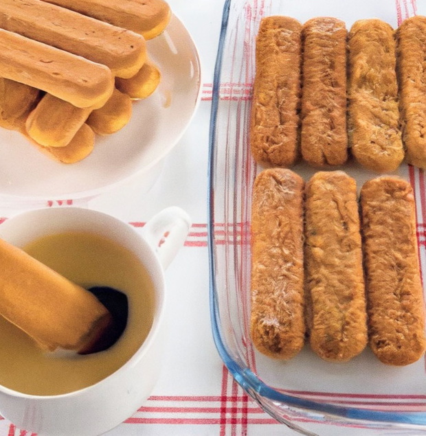 3. Biszkopty namoczyć w kawie wymieszanej z likierem. Połowę ułożyć na dnie naczynia.
