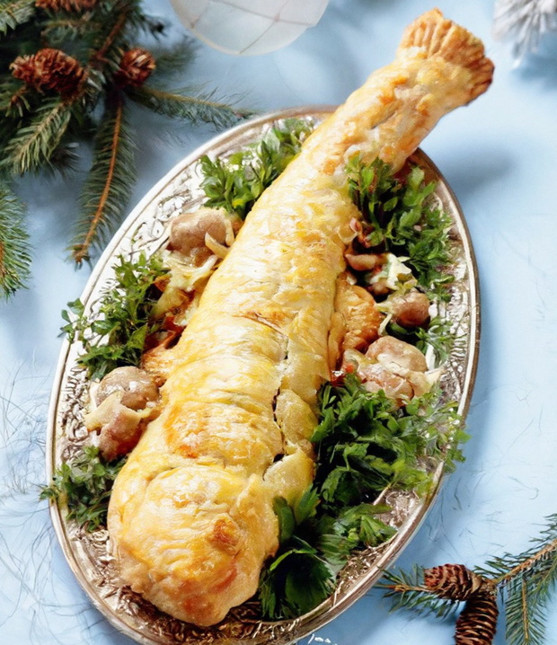 Rybę podzielić na dzwonka. Doprawić ziołami, solą, pieprzem, zmiażdżonym czosnkiem. Zawinąć w płat ciasta. Piec ok. 20 min w 200°C na blasze wyłożonej pergaminem. Grzyby udusić na maśle z pokrojoną cebulą. Doprawić, dodać śmietankę. Podawać z rybą udekorowaną natką.