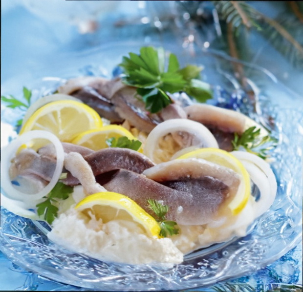 ● 4 solone matiasy ● po 2 cebule, jabłka i cytryny ● 250 g słodkiej śmietanki ● cukier ● natka