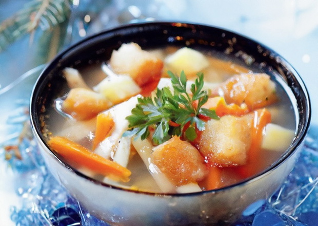 Włoszczyznę pokroić w słupki, brukiew i ziemniaki w kostkę. Ugotować ze wszystkimi przyprawami prócz majeranku – ten dodajemy na samym końcu razem ze szczyptą cukru (zupa ma mieć słodki posmak). Kromki bagietki natrzeć czosnkiem, pokroić w kostkę, zrumienić na maśle. Podawać z zupą.