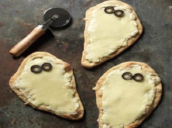 Zmieszaj oliwę i czosnek razem w małej misce i pędzlem posmaruj równomiernie wszystkie duszki. Posyp solą (pół łyżeczki) i pieprzem (1/4 łyżeczki). Wstaw do piekarnika i piecz, aż skórki będą złociste, przez około 10-12 minut, po czym obróć placki na drugą stronę i piecz dalej przez tyle samo czasu. Zmieszaj ricottę, parmezan i włoską przyprawę razem w małej misce i rozsmaruj po duszkach, zostawiając około półtora centymetra czystej krawędzi naokoło. Posyp mozarellą i wstaw z powrotem do piekarnika, na około 5 minut - dopóki duszki nie będą gorące a ser całkowicie roztopiony. Na każdym duszku umieść po 2 krążki oliwek jako oczy i opcjonalnie jeden jako usta.