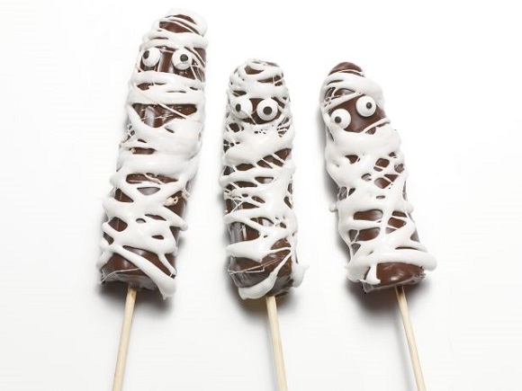Podgrzewaj w kuchence mikrofalowej pianki marshmallows (po 2 na każdą połówkę banana), aż urosną, zajmie to około 10-15 sekund. Wymieszaj je, aby masa była gładka i trochę wystudź. Przy pomocy łyżki zbierz masę z pianek, która będzie się rozciągać, i rozprowadź ją naokoło bananów, tworząc rysunek bandaży. Przełóż na talerz wyłożony papierem pergaminowym i zamroź przed podaniem.