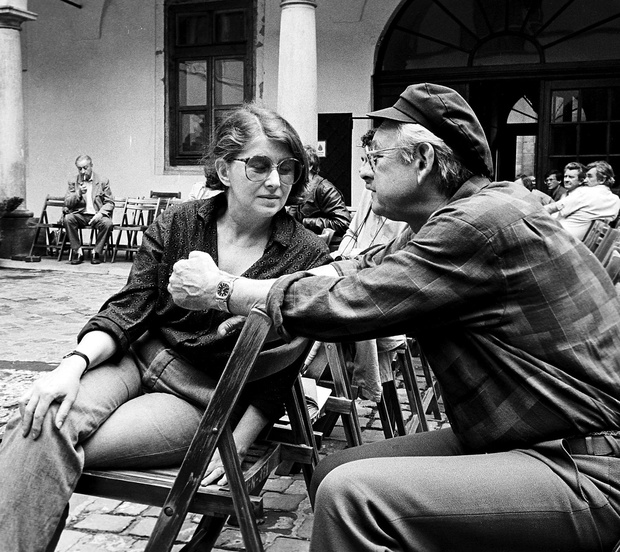 1986 Krakow Kolegium Nowodoworskie Proba do spektaklu ” Zemsta ” Aleksandra Fredro w Teatr Stary w rezyserii Andrzej Wajda n/z Andrzej Wajda rezyser i Krystyna Zachwatowicz