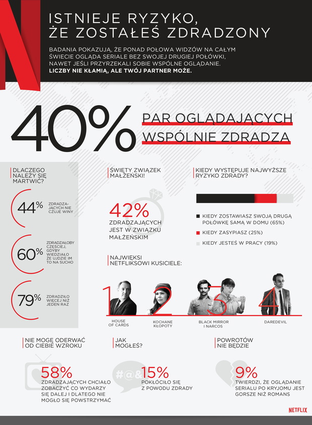 Wyniki najnowszych badań, opublikowane przez Netflix, potwierdzają, że niemal połowa (46%) par połączonych węzłem wspólnego oglądania zdradziła swoją drugą połówkę. Na szczęście Polska plasuje się w pierwszej trójce najwierniejszych krajów – 60% badanych przyznaje, że nigdy nie zdradziło swojego partnera. 40 % jednak potajemnie ogląda kolejne odcinki kiedy są sami w domu.