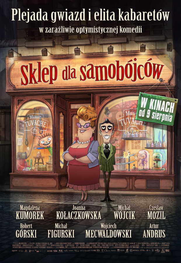Nie byłoby sklepu gdyby nie jego wyjątkowi klienci. W polskiej wersji Sklepu dla samobójców usłyszymy Czesława Mozila jak śpiewa i Michała Figurskiego jak radzi sobie z obniżonym poziomem życia. Córkę właścicieli sklepu gra Magdalena Kumorek, główna bohaterka popularnego serialu TVN Przepis na życie, a syna Wojciech Mecwaldowski, jeden z najlepszych aktorów komediowych młodego pokolenia, z niezapomnianymi kreacjami w 39 i pół, Lejdis czy Usta Usta. W rolach klientów sklepu usłyszymy najlepszych z najlepszych polskich kabaretów: Kabaret Moralnego Niepokoju, Ani Mru Mru, Hrabi, Neo-Nówka, czy Paranienormalni i gwiazdy serialu kabaretowego Spadkobiercy. Swoich artystycznych talentów dołożył także Władysław Sikora, lider kultowego kabaretu Potem, wcielając się w rolę Pana Calmela oraz pisząc teksty do piosenek. Autorem polskich dialogów jest Bartek Kędzierski, twórca Włatców Móch - najpopularniejszej dotąd rodzimej animacji.