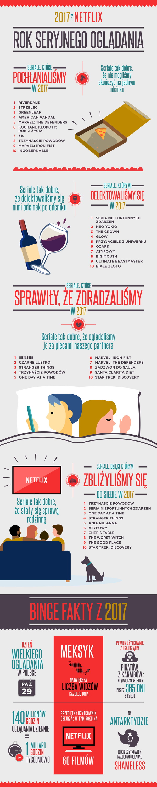Użytkownicy serwisu Netflix z całego świata spędzali na oglądaniu ponad 140 milionów godzin dziennie (to nieco więcej niż miliard godzin tygodniowo). Najpopularniejszą datą1 wybieraną na seans przez widzów z Polski była niedziela 29 października – weekend pełen imprez halloweenowych sprawił, że potrzebowaliśmy relaksującej dawki rozrywki.