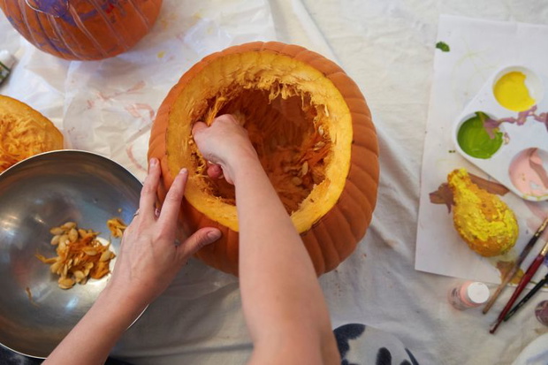 - Wydrąż z dyni środek. Im dokładniej wyjmiesz miąższ, tym twój lampion dłużej wytrzyma.