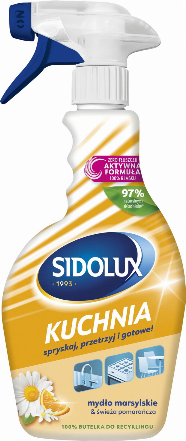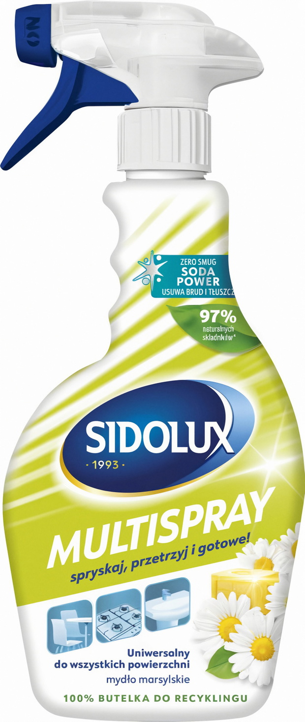 Jednym z takich produktów jest SIDOLUX MULTISPRAY o kultowym, niezwykle przyjemnym zapachu mydła marsylskiego i składzie w 97% opartym na składnikach naturalnych. Świetnie sprawdzi się w czyszczeniu różnych powierzchni, jest bezpieczny do stosowania w miejscach przyrządzania posiłków, jak również delikatnych mebli np. z drewna. Co ważne, jest nie tylko multizadaniowy, ale również prosty w użyciu - wystarczy spryskać, przetrzeć i gotowe! Koniec z dylematem: "Czym jak mam to czyścić?" Ponadto płyn pozostawia uczucie czystości i świeżości na dłużej, a jego aplikacja możliwa jest także nawet w trudno dostępnych miejscach.
