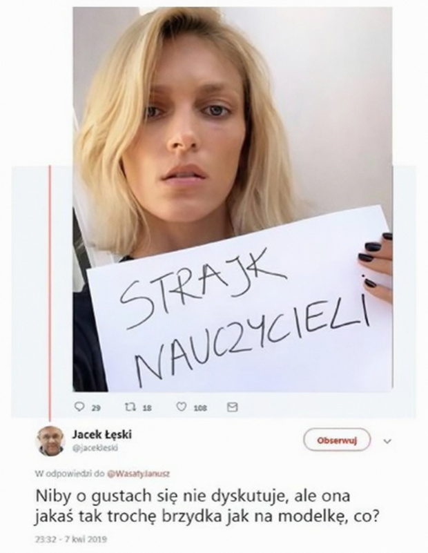 Znana z odważnych politycznych i społecznych deklaracji Anja Rubik często musi mierzyć się z hejtem i krytyką ze strony internautów. Po tym, jak modelka zadeklarowała swoje wsparcie dla strajkujących nauczycieli, spadła na nią fala krytyki. Komentujący zarzucili jej, że nie ma pojęcia o realiach pracy w szkole. W komentarzach powtarza się też nie do końca zasadny argument o tym, że nauczyciele pozornie mają więcej wolnego niż inne grupy zawodowe. Na słowa Anji Rubik zareagował także dziennikarz TVP, Jacek Łęski, znany z takich programów jak „Alarm!”, „Biznes info” czy „Studio Polska”. Łęski dla odmiany nie przedstawił żadnych merytorycznych argumentów, zamiast tego pozwalając sobie na seksistowską uwagę pod adresem gwiazdy: