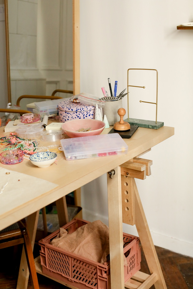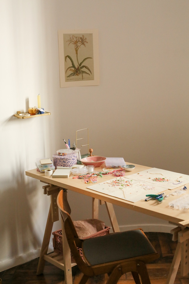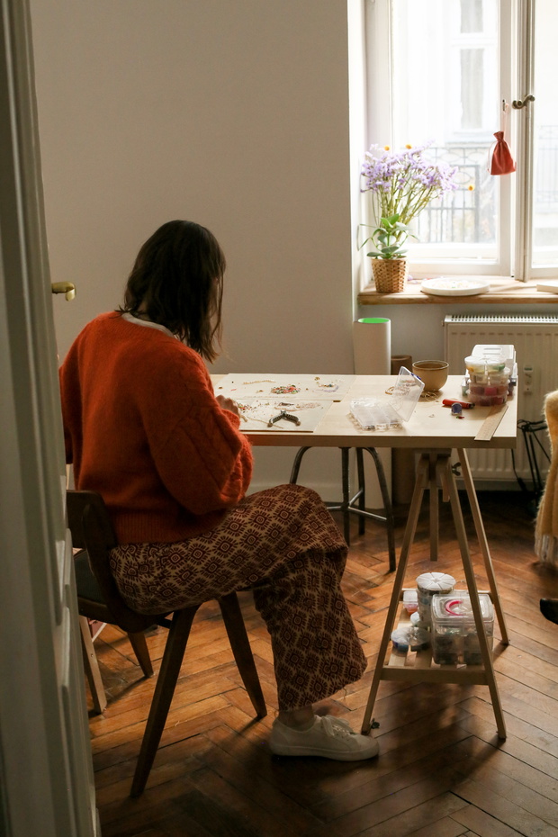 M.S: Biżuterię wykonują dwie osoby, ja i moja współpracowniczka Diana. Mam jeszcze dodatkowe wsparcie od strony graficznej i fotograficznej. Poza tym wszystkim zarządzam samodzielnie, projekty również są moje. Jeśli chodzi o czas realizacji kolekcji, wygląda to następująco: orientacyjnie w miesiąc wszystko obmyślam, tworzę paletę barw i połączeń kolorystycznych, zapisuję rożne wzory, które chce wykonać, obserwuję ludzi, dziewczyny i szukam inspiracji. Bardzo inspiruję i przyciąga mnie dziewczęcość, z niej czerpię dużo pomysłów. To też jest fascynujące dla mnie w Warszawie - ten przekrój ludzi, jedni wyglądają bardziej szaro, nie wyróżniają się w tłumie inni są mega przyciągający - obserwuję to w okolicy mojej pracowni przy ulicy Brackiej. To fragment miasta gdzie przewija się wiele ciekawych osób. W tworzeniu biżuterii inspirują mnie też moje ulubione artystki np. Ana Kraš i Lina Scheynius. To jest ten pierwszy etap.
