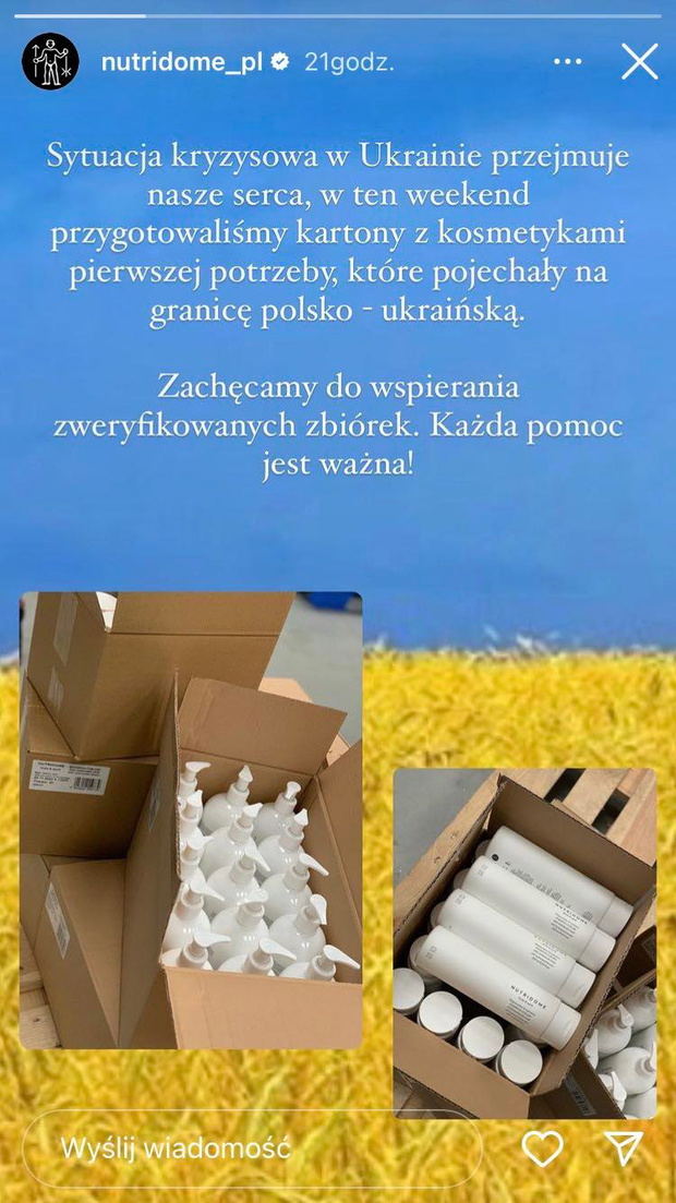 Marka Nutridome przekazała potrzebującym "kosmetyki pierwszej potrzeby". Sama przetransportowała je na granicę. [...] w ten weekend przygotowaliśmy kartony z kosmetykami pierwszej potrzeby, które pojechały na granicę polsko-ukraińską - napisano na Instagramie marki.