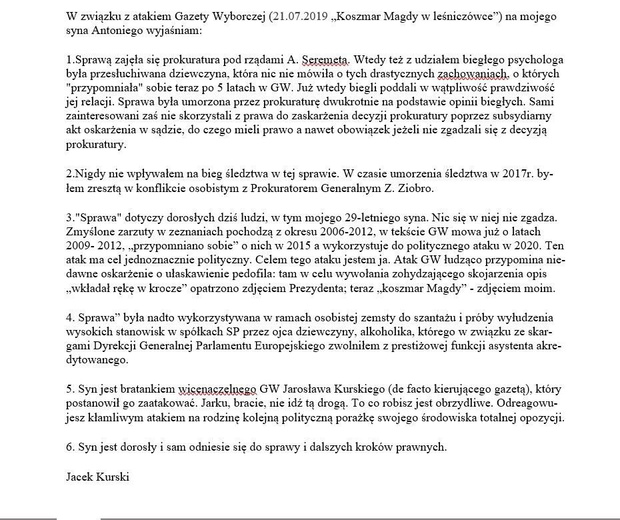 - „Sprawa” była nadto wykorzystywana w ramach osobistej zemsty do szantażu i próby wyłudzenia wysokich stanowisk w spółkach SP przez ojca dziewczyny, alkoholika, którego w związku ze skargami Dyrekcji Generalnej Parlamentu Europejskiego zwolniłem z prestiżowej funkcji asystenta akredytowanego – czytamy w oświadczeniu Jacka Kurskiego.