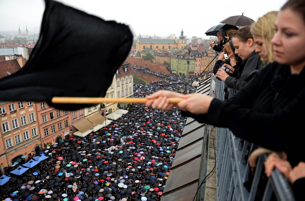A girl waves a black flag as people take part in a nationwide strike and demonstration to protest against a legislative proposal for a total ban of abortion on October 3, 2016 in Warsaw. Thousands of women dressed in black protested across Poland in the „Women strike” campaign against a proposed near-total abortion ban in the devoutly Catholic country where legislation is already among the most restrictive in Europe. / AFP PHOTO / JANEK SKARZYNSKI