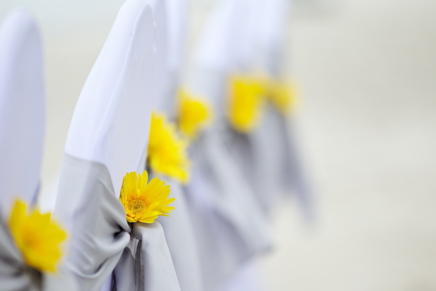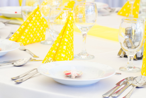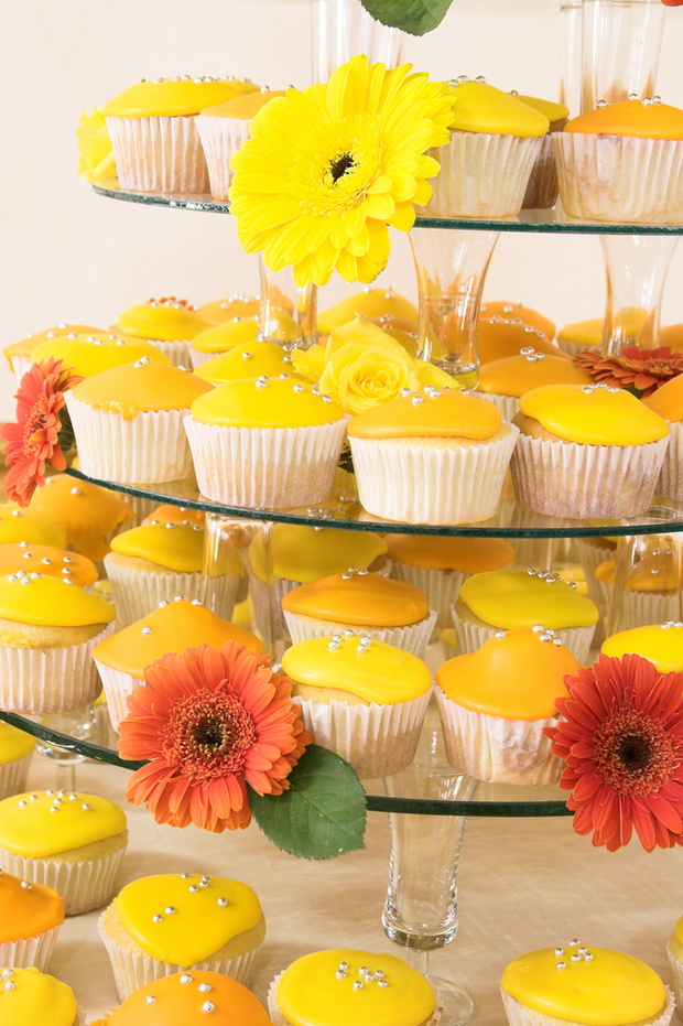 Kolor dojrzałej cytryny świetnie komponuje się z bielą, a więc jest idealnym kolorem przewodnim na ślub i wesele. Dodatkowo jest bardzo świeży i energetyczny i kojarzy się z latem i słońcem. Na żółty kolor możesz postawić wybierając bukiet ślubny – mogą to być wiosenne tulipany czy klasyczne róże, również w bukietach dla druhen oraz wystroju kościoła i kwiatach na stoliki. Świetną dekoracją są też same owoce cytryn ustawione w przezroczystych wazonach. Żółte mogą być też wszelkie dodatki – buty Panny Młodej, suknie druhen czy krawat Pana Młodego. W tak pozytywnym wystroju nie może oczywiście zabraknąć żółtego tortu. Możesz zdecydować się na tradycyjny – kilkupiętrowy, lub popularny ostatnio zestaw kolorowych cupcakes'ów.