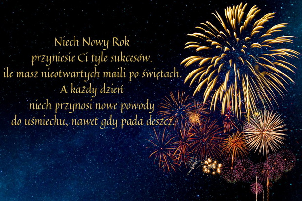 Niech Nowy Rok przyniesie Ci tyle sukcesów, ile masz nieotwartych maili po świętach. A każdy dzień niech przynosi nowe powody do uśmiechu, nawet gdy pada deszcz.
