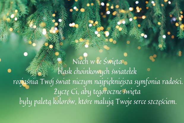 Niech w te Święta blask choinkowych światełek rozjaśnia Twój świat niczym najpiękniejsza symfonia radości. Życzę Ci, aby tegoroczne święta były paletą kolorów, które malują Twoje serce szczęściem.