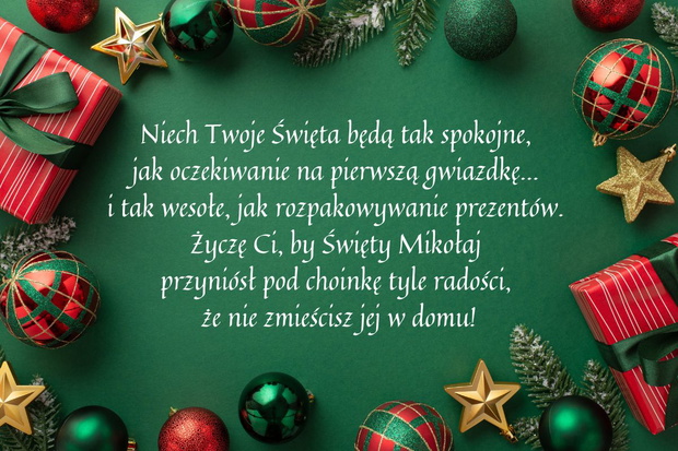 Niech Twoje Święta będą tak spokojne, jak oczekiwanie na pierwszą gwiazdkę... i tak wesołe, jak rozpakowywanie prezentów. Życzę Ci, by Święty Mikołaj przyniósł pod choinkę tyle radości, że nie zmieścisz jej w domu!