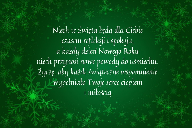 Niech te Święta będą dla Ciebie czasem refleksji i spokoju, a każdy dzień Nowego Roku niech przynosi nowe powody do uśmiechu. Życzę, aby każde świąteczne wspomnienie wypełniało Twoje serce ciepłem i miłością.