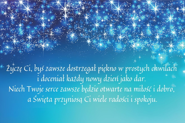 Życzę Ci, byś zawsze dostrzegał piękno w prostych chwilach i doceniał każdy nowy dzień jako dar. Niech Twoje serce zawsze będzie otwarte na miłość i dobro, a Święta przyniosą Ci wiele radości i spokoju.