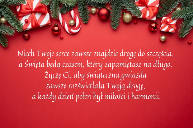 Niech Twoje serce zawsze znajdzie drogę do szczęścia, a Święta będą czasem, który zapamiętasz na długo. Życzę Ci, aby świąteczna gwiazda zawsze rozświetlała Twoją drogę, a każdy dzień pełen był miłości i harmonii.